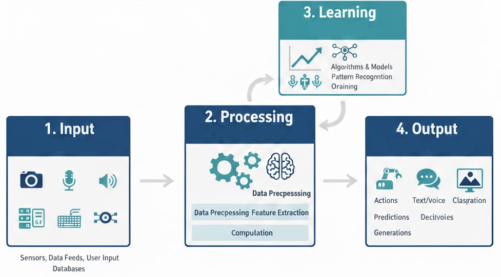 การทำงานของ AI อาศัยการประมวลผลข้อมูลร่วมกับอัลกอริทึม (Algorithm) โดยมีขั้นตอนสำคัญ ดังนี้