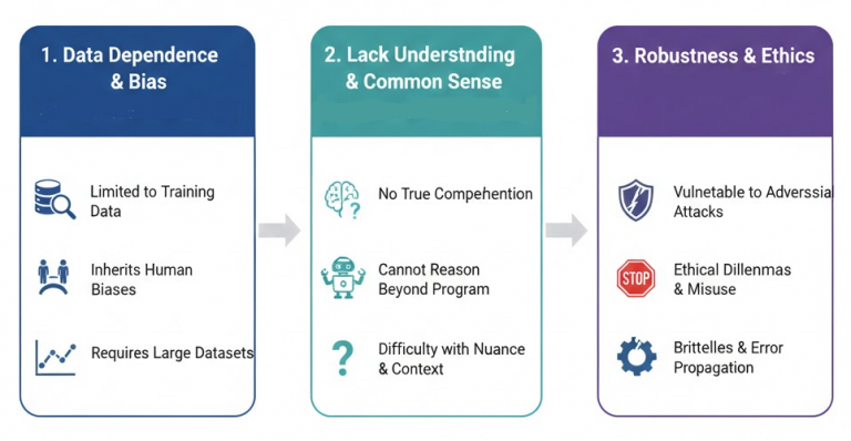 ข้อจำกัดหลักของการทำงานของ AI (ปัญญาประดิษฐ์) ในปัจจุบันครอบคลุมทั้งด้านเทคนิค จริยธรรม และทรัพยากร แม้ AI จะมีประสิทธิภาพสูง แต่ยังมีข้อจำกัด ได้แก่