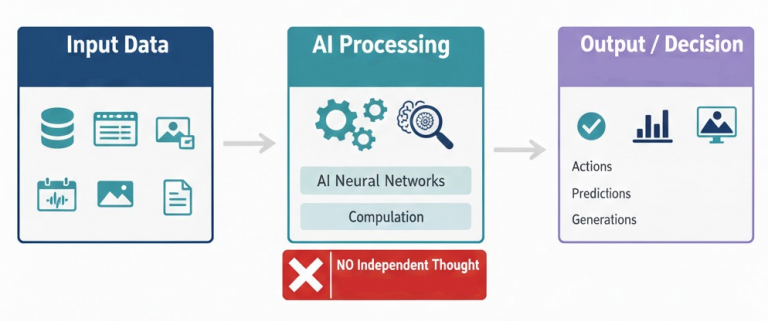 AI ไม่มีจิตสำนึก ความรู้สึก หรือความเข้าใจเชิงเหตุผลเหมือนมนุษย์ การตัดสินใจของ AI เป็นผลจากการคำนวณความน่าจะเป็นและรูปแบบของข้อมูลเท่านั้น